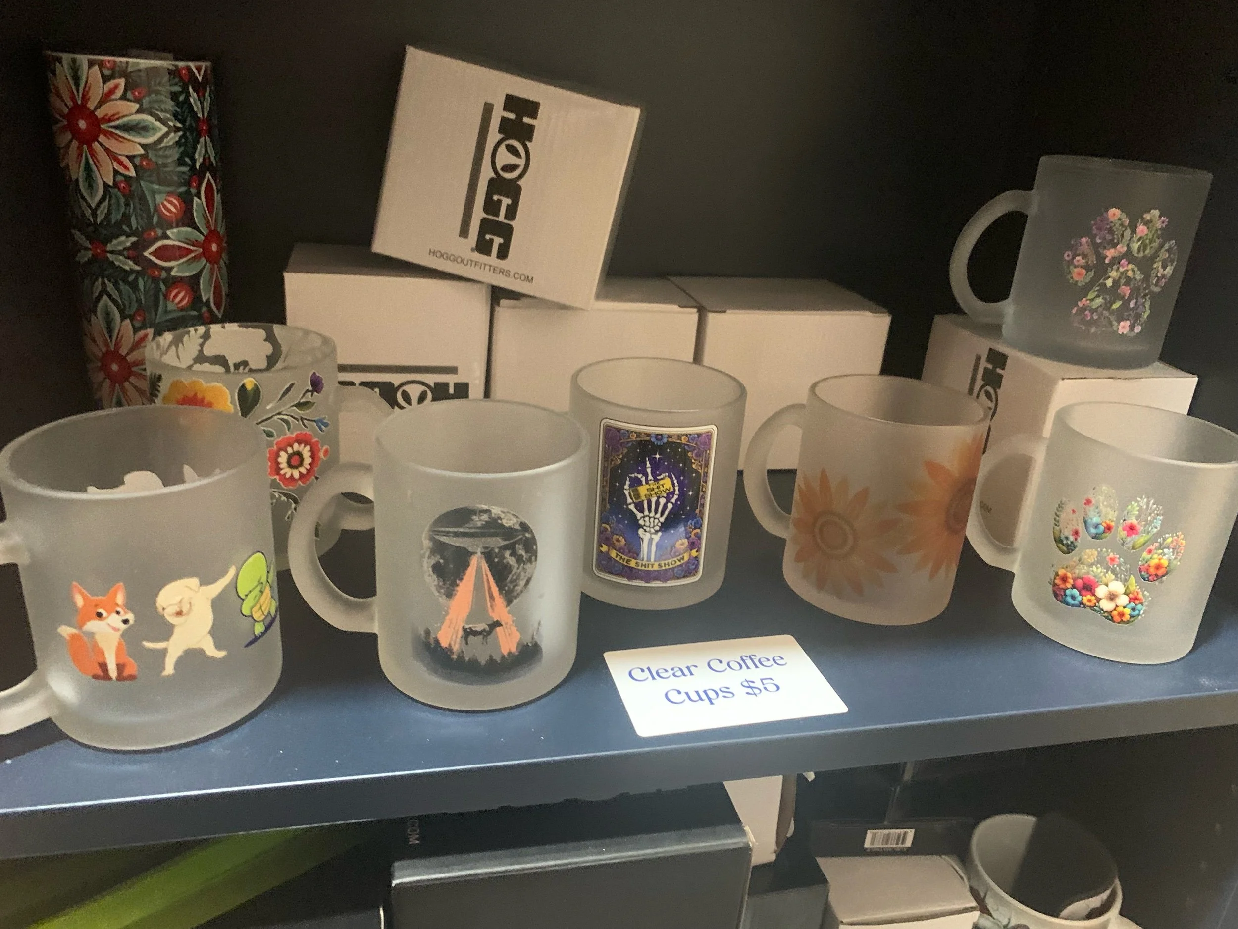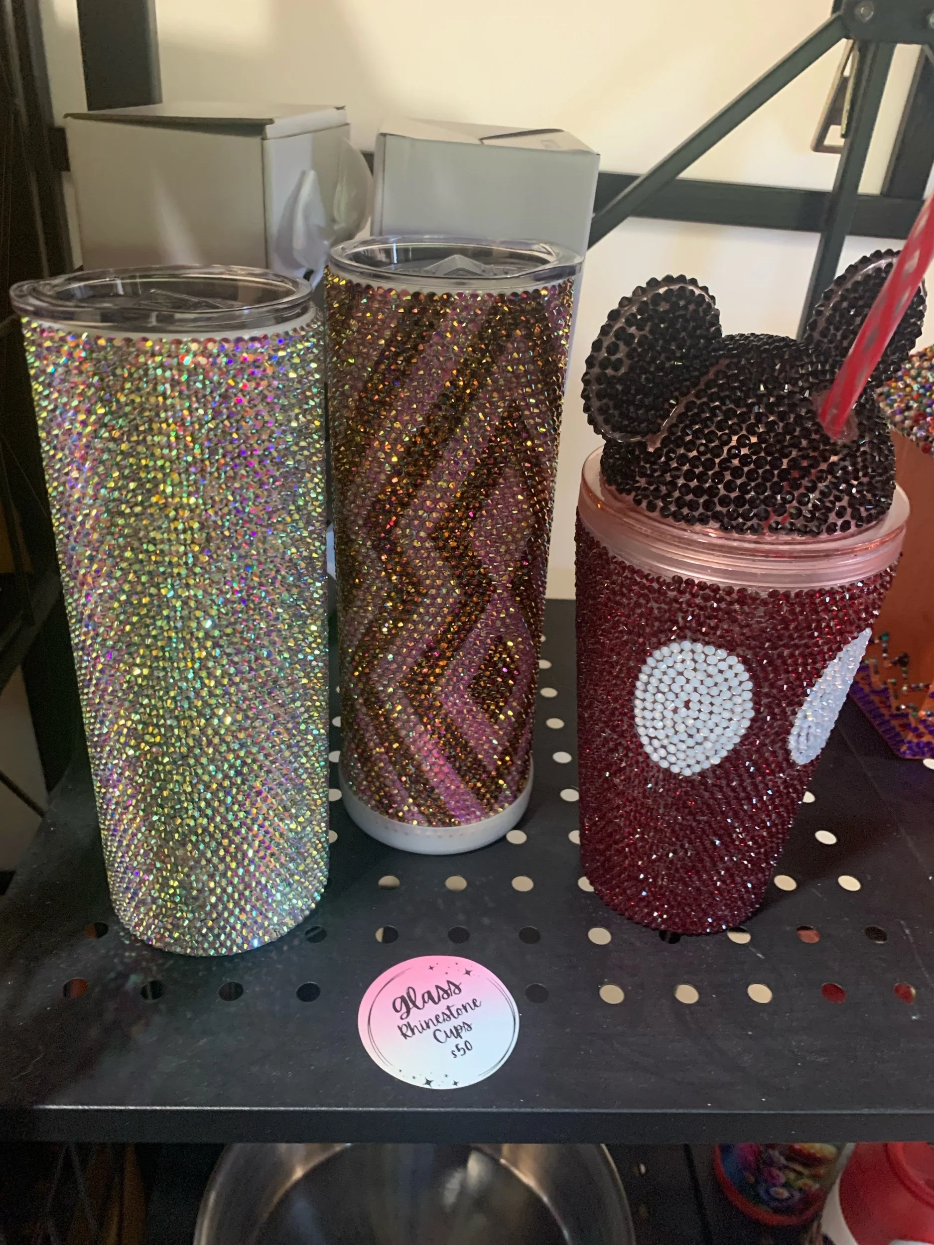 Categories: All Drinkware All | Drinkware | 15 oz coffee mug $10.00 Comes with the little one too $30.00 Rhinestone Cups $50.00 Coffee cup and Tea Towel Set $17.00 Cute Custom Tumblers $20.00 Kids water Bottles or Spray Misters $15.00 clear coffee mugs $5.00 Flasks $15.00 Shortie Tumblers $15.00 Mini cups $10.00 DIY Rhinestone Cup $40.00
